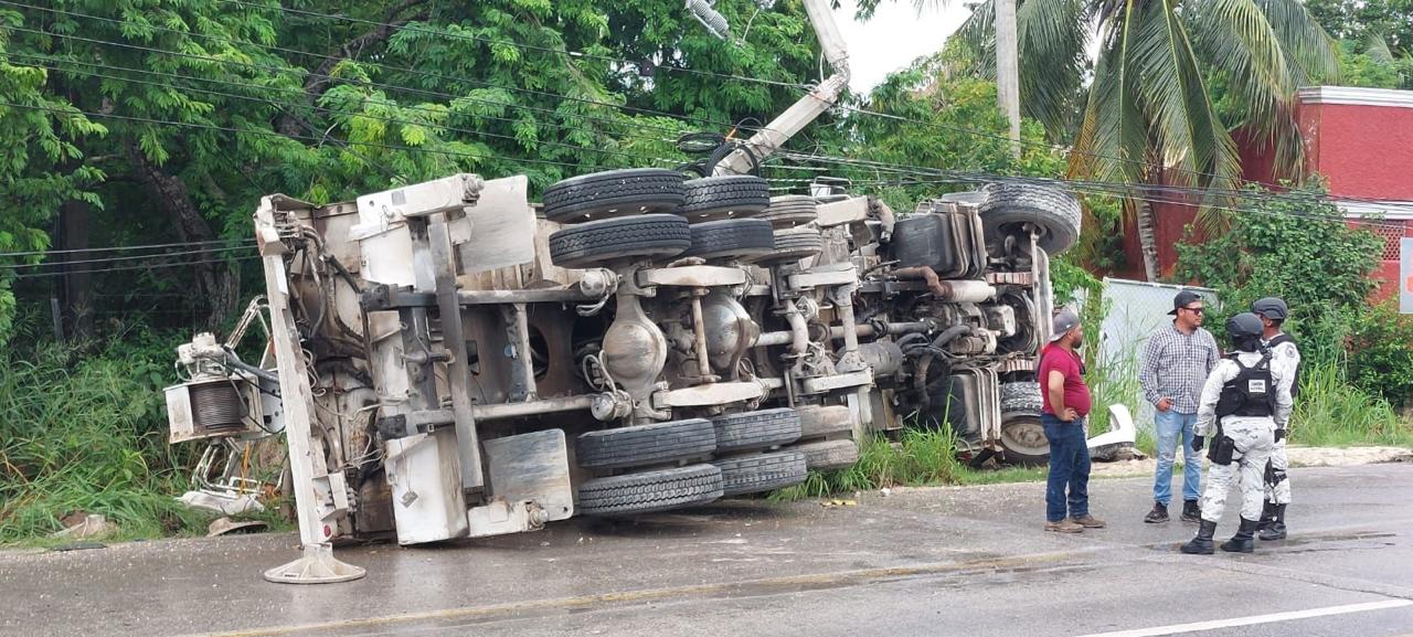 Playa del Carmen.- Esta tarde, el conductor de una grúa perdió el control, al parecer por ir a exceso de velocidad, y terminó volcando su unidad sobre auto estacionado y quebrando un poste de alta tensión, en el tramo carretero Playa del Carmen-Tulum.