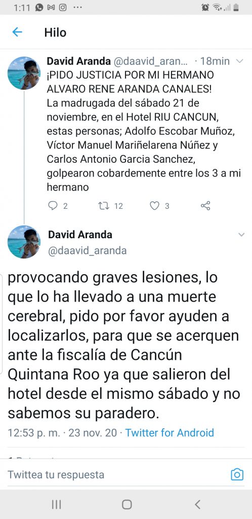 luego de que se diera a conocer que en el hotel riu Cancún tres jóvenes golpearon a otro y lo dejaron en coma para luego morir al segundo día, el hotel Riu informa lo siguiente: