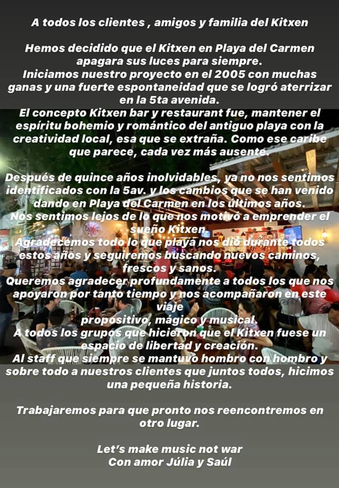 Por las malas decisiones de Laura Beristain, truena otro negocio en la 5ta. Avenida, se trata del bar Kitxen, propiedad del líder de Caifanes. Saúl Herández, quien anunció el cierre del lugar.