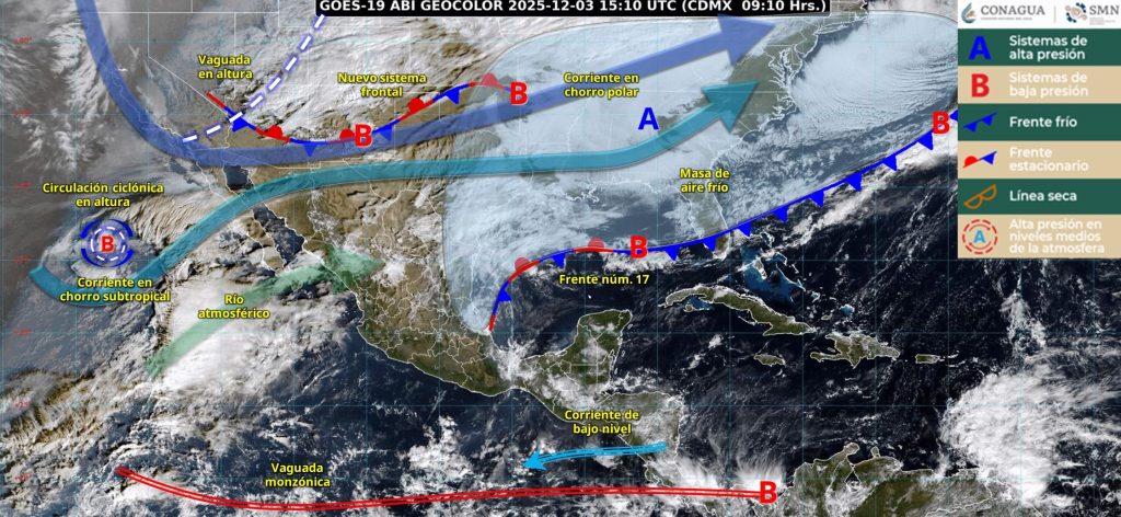 Por otro lado, un nuevo sistema frontal se aproximará al noroeste y norte de México, interaccionará con una vaguada en niveles medios y altos de la atmósfera y con un río atmosférico, propiciando descenso de temperatura, rachas de viento de 60 a 80 kilómetros por hora, lluvias a intervalos de chubascos en dichas regiones, pronosticándose lluvias puntuales fuertes en Baja California Sur; así como probabilidad de lluvia engelante o caída de aguanieve en sierras de Chihuahua (sur), Durango y Sinaloa.