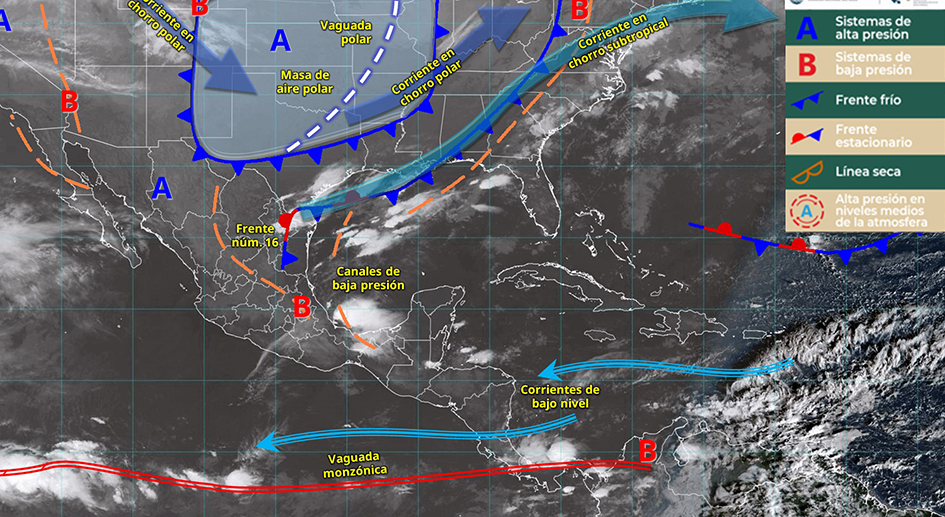 Por otro lado, el frente frío 16 será reforzado por una masa de aire polar, por lo que se desplazará sobre el noreste y oriente del territorio nacional.