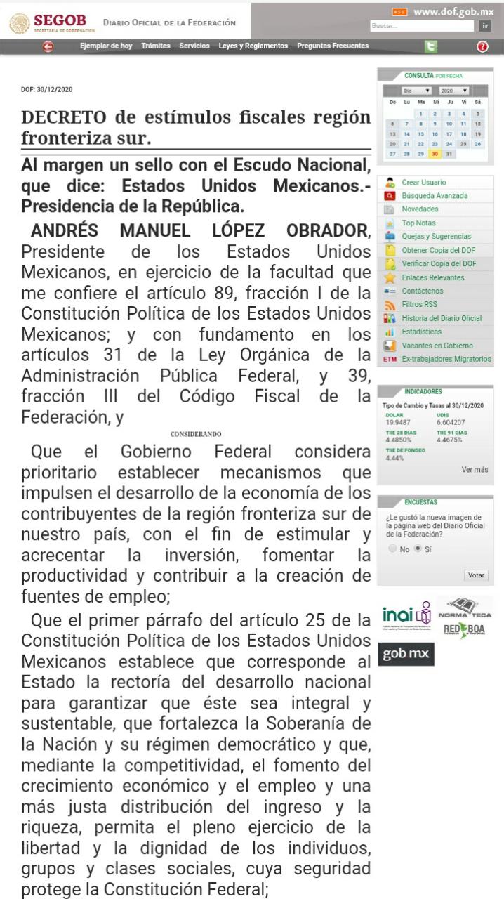 El Gobierno Federal, a través del Diario Oficial de la Federación publicó este miércoles el decreto de estímulos fiscales región fronteriza sur, que considera los estímulos fiscales para la región fronteriza sur y que forman parte de una estrategia integral del Gobierno de México cuya intención es mejorar el bienestar de la población en esa región, a través de beneficios fiscales consistentes en la disminución de la carga fiscal de los contribuyentes del impuesto al valor agregado y del impuesto sobre la renta a las empresas y personas físicas con actividad empresarial.