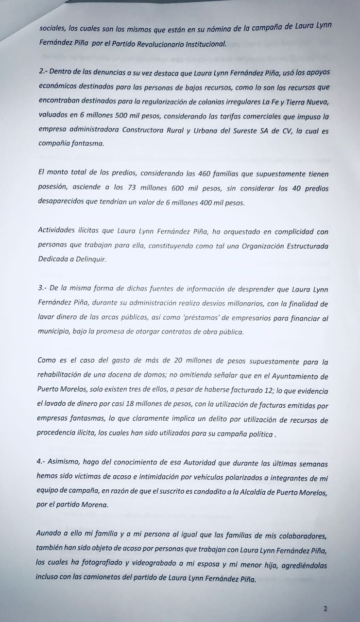 En la denuncia de Aguilera Negrón se destaca que de fuentes de información se desprenden que la aun alcalde de Puerto Morelos realizó durante su administración desvíos millonarios con la finalidad de “lavar dinero” de las arcas públicas, así como préstamos de empresarios para financiar al municipio con la promesa de otorgarles contratos de obra pública.