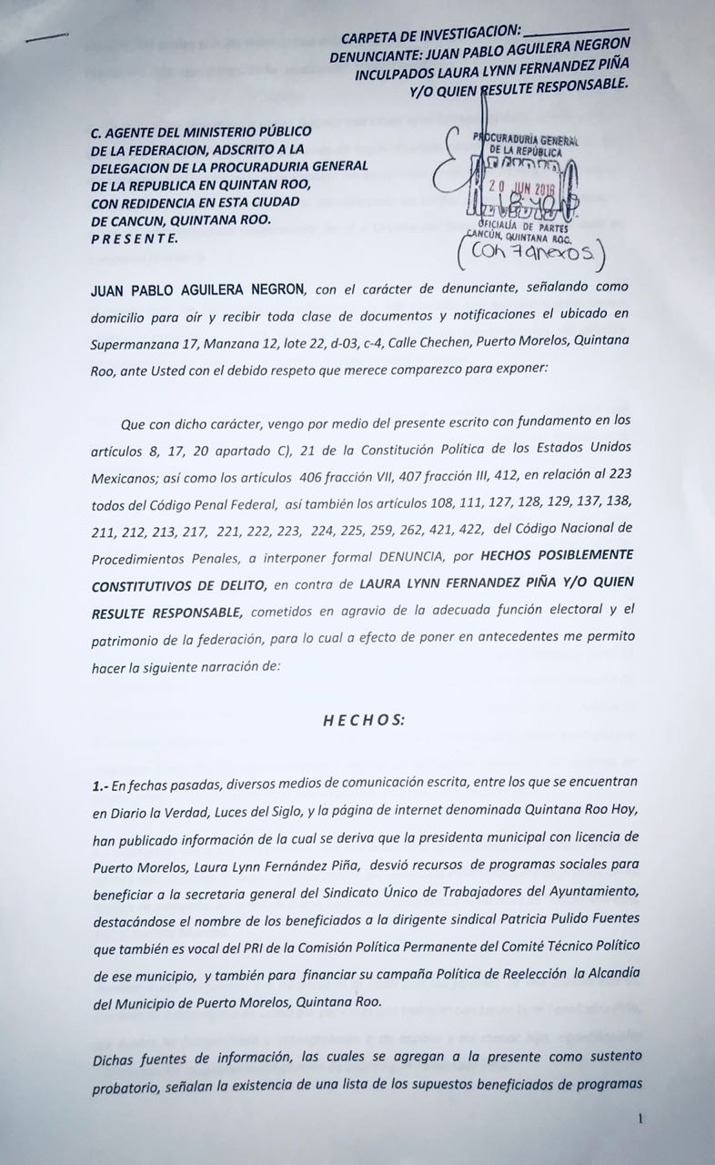 PUERTO MORELOS, Quintana Roo.- Por amenazas, desvío de recursos y presunto fraude con tierras, Laura Fernández Piña, quien busca la reelección en Puerto Morelos con la coalición PRI-Verde-Panal, fue denunciada ayer por la tarde en la Procuraduría General de la República (PGR) por Juan Pablo Aguilera Negrón, candidato de la coalición “Juntos haremos historia” a la alcaldía del mismo destino.