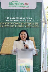 Durante su mensaje, la presidenta municipal Blanca Merari Tziu Muñoz subrayó la vigencia y trascendencia de la Constitución como base de la vida democrática del país.