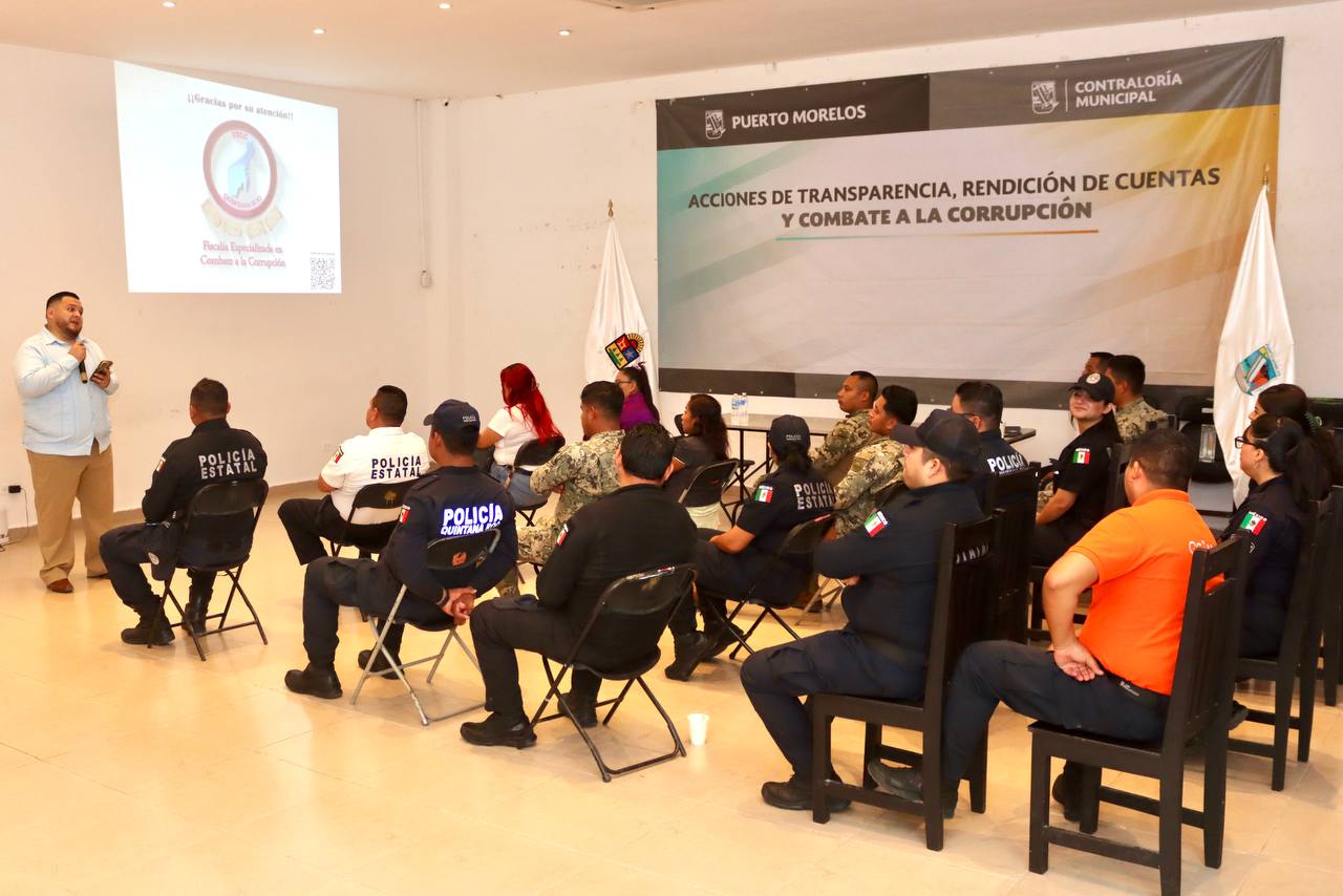 PUERTO MORELOS.- Elementos de la Secretaría municipal de Seguridad Pública y Tránsito y de la Secretaría de Marina concluyeron el curso-taller “Prevención de delitos por hechos de corrupción”, impartido por personal de la Fiscalía Especializada en Combate a la Corrupción del Estado de Quintana Roo, que se llevó a cabo en la Sala del Cabildo del Palacio Municipal.