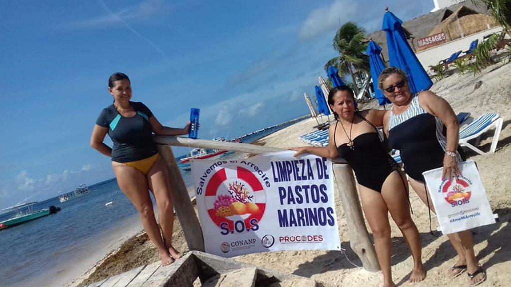 Maru García, Yorlet Espin y Leticia Romero, voceras de SOS SALVEMOS AL ARRECIFE realizaron este sábado 10 de agosto de 2019 la primera jornada para depurar el sector de pastos marinos ubicado en el muelle Pelícanos, parte náutica central colindante al Parque Marino Nacional Arrecife de Puerto Morelos, zona regulada por la Comisión Nacional de Areas Naturales Protegidas (CONANP) de la que depende la economía de numerosas familias y es el principal motor turístico del undécimo municipio.