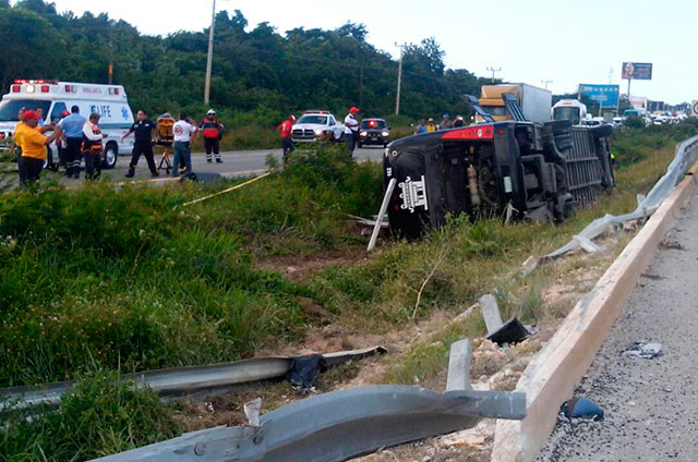 El accidente fue ubicado de igual manera a aproximadamente 4 km y medio del puente federal del Municipio de Puerto Morelos, autobús turístico de 56 plazas transportando a 54 pasajeros más el conductor de nombre Juan Manuel Rodríguez Hernández, originario del DF el cual también resultó lesionado y fue trasladado por paramédicos para su atención médica.
