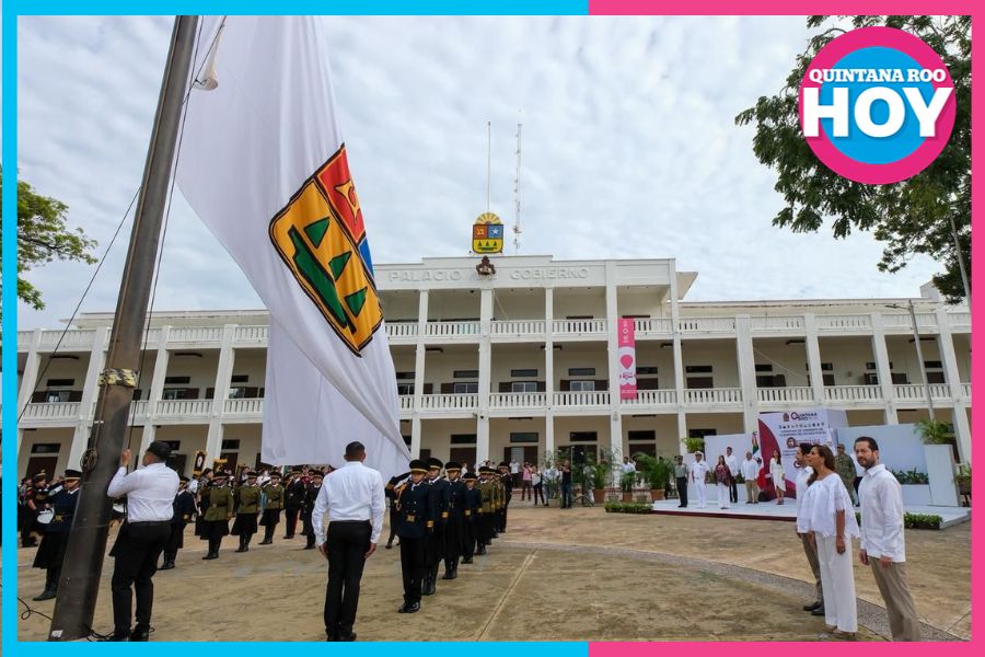 Chetumal.- La gobernadora Mara Lezama Espinosa encabezó la ceremonia de izamiento de la bandera de Quintana Roo en ocasión del 51 aniversario de su creación como Estado Libre y Soberano, evento en el que se estrenó la Banda de Guerra Monumental de más de 112 elementos, niños y jóvenes, así como las escoltas de Bandera Nacional y Estatal que se integra con 8 organizaciones cívicas libres y planteles educativos.