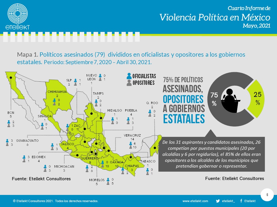 Etellek dio a a conocer que con objeto de ofrecer al público en general y a organizaciones públicas, privadas y sociales información cuantitativa que permita dimensionar un problema que pone en riesgo el futuro del progreso democrático y la competitividad del país, presentaron su Cuarto Informe de Violencia Política en México 2021, con el análisis estadístico de las agresiones contra políticos y candidatos registradas mediante el monitoreo de fuentes abiertas, cubriendo el periodo que comprende del 7 de septiembre de 2020 (inicio del proceso electoral) al 30 de abril de 2021.