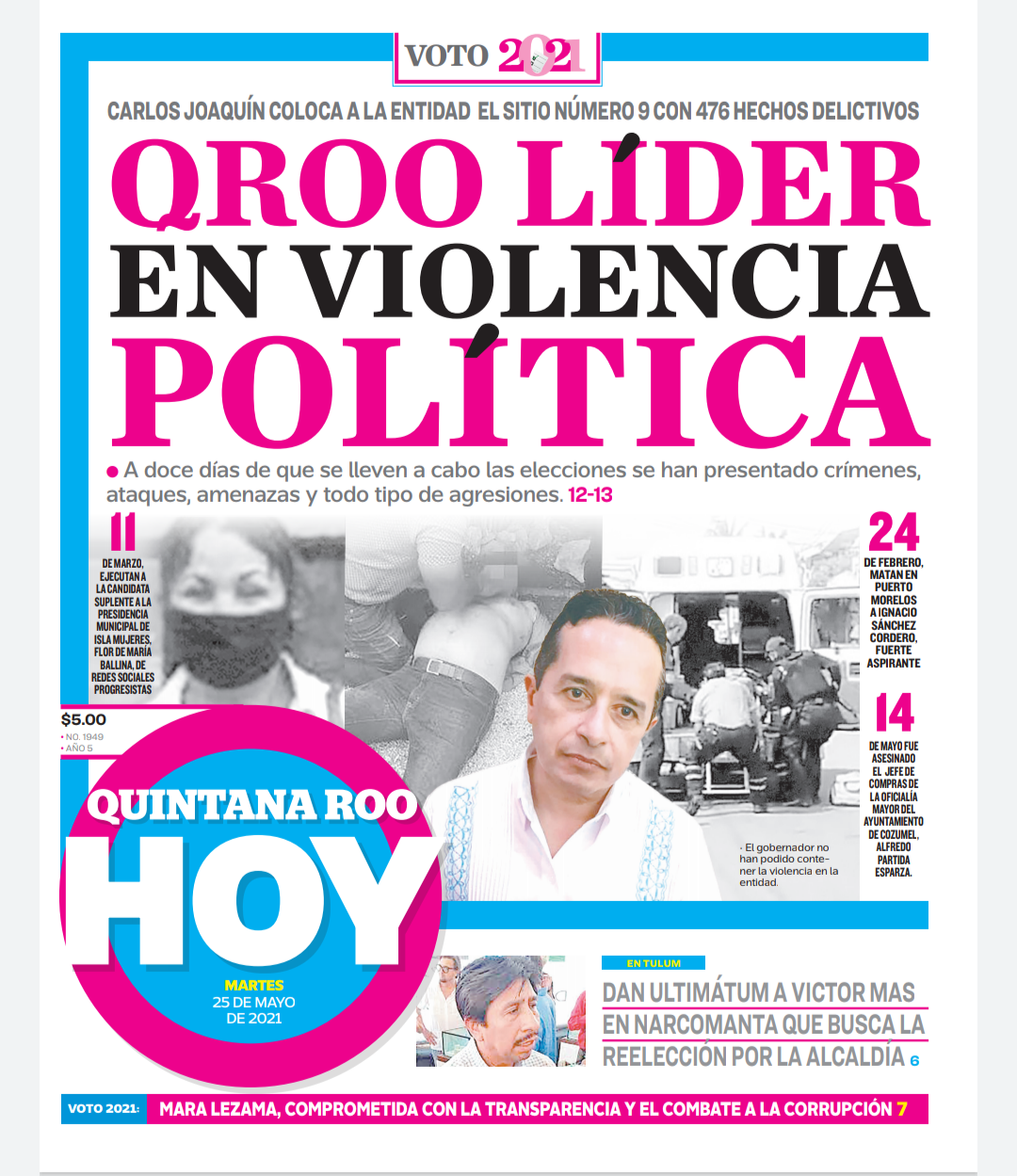 Del total de las víctimas mortales ligadas a la política y al servicio público durante el proceso electoral, tres se registraron en el estado de Quintana Roo, pues recordemos que el primer crimen se dio el 24 de febrero cuando un sujeto entró a una cafetería en Puerto Morelos y le disparó en varias ocasiones a Ignacio Sánchez Cordero, quien justamente ese día sería presentado como candidato del PVEM a la presidencia municipal, unos 15 días después, el 11 de marzo, la candidata suplente a la presidencia municipal Flor de María Ballina, de Redes Sociales Progresistas, fue ultimada con arma de fuego en un bar donde laboraba junto con su esposo y el 14 de mayo fue asesinado a balazos en la puerta de su casa el jefe de compras de la Oficialía Mayor del Ayuntamiento de Cozumel, Alfredo Partida Esparza.