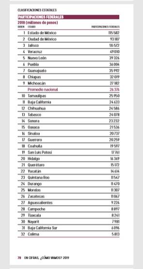 Sin embargo, ocupa el lugar 26 (de 32 estados) en el monto de aportaciones federales que recibe y el lugar 23 en participaciones federales, muy por debajo de la media nacional. Los estados que reciben más recursos del gobierno de México a través de estos mecanismos son Estado de México, Ciudad de México, Veracruz, Jalisco, Puebla y Chiapas, según el compendio 2109 de “En Cifras, ¿Cómo Vamos?”.