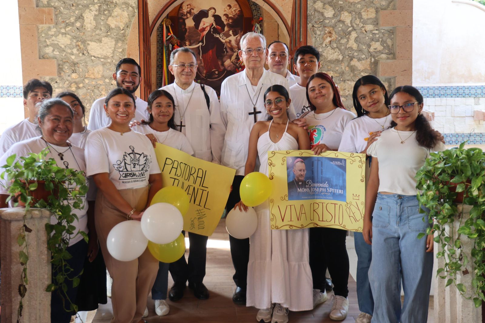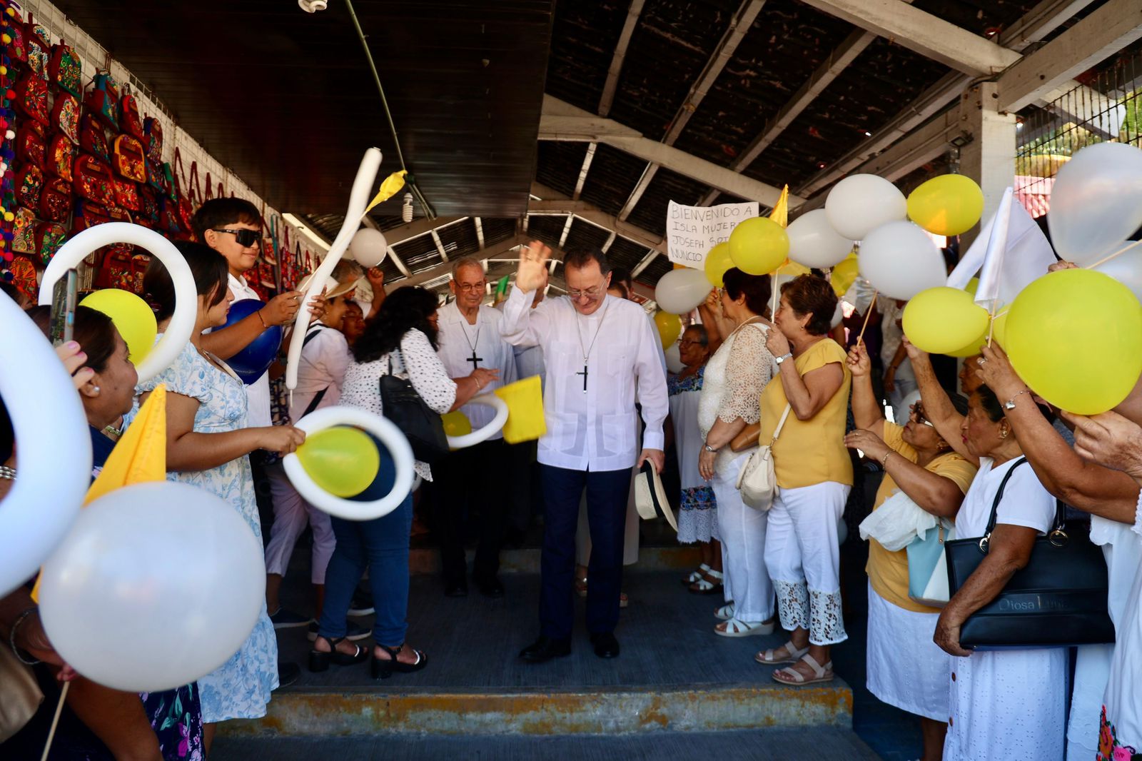 La comunidad religiosa participó activamente portando globos blancos y amarillos, así como mensajes de bienvenida, simbolizando la alegría por recibir al enviado del Vaticano.