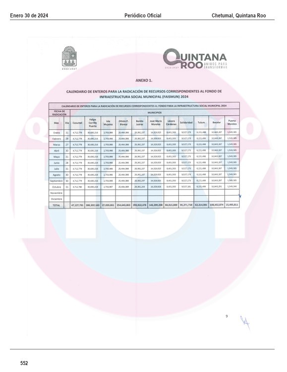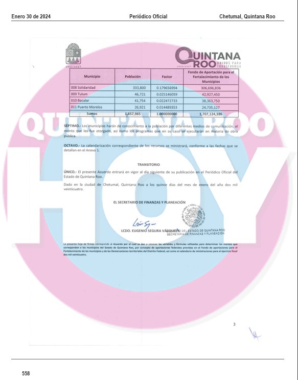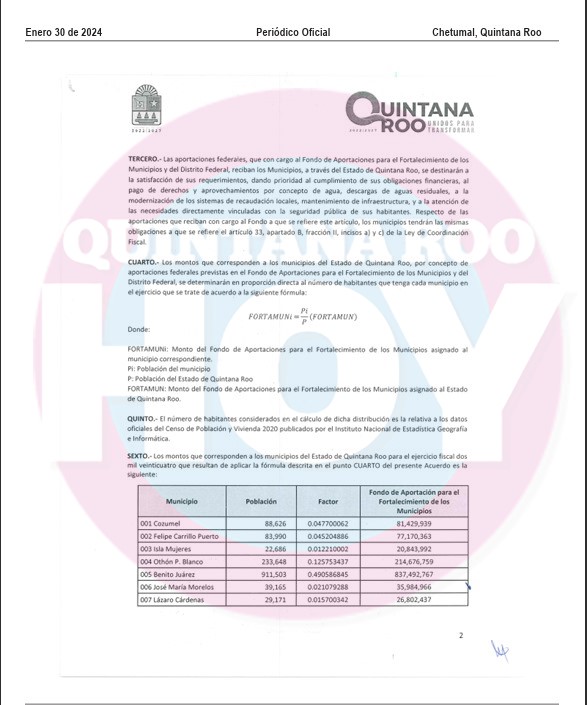 Según el documento, los recursos para Cozumel serán mensualmente 47 millones 127 mil 791 pesos; para Felipe Carrillo Puerto, 306 millones 302 mil 163 pesos; Isla Mujeres, 27 millones 039 mil 861 pesos; Othón P. Blanco, 254 millones 643 mil 863 pesos; y Bacalar, 108 millones 432 mil 874 pesos.
