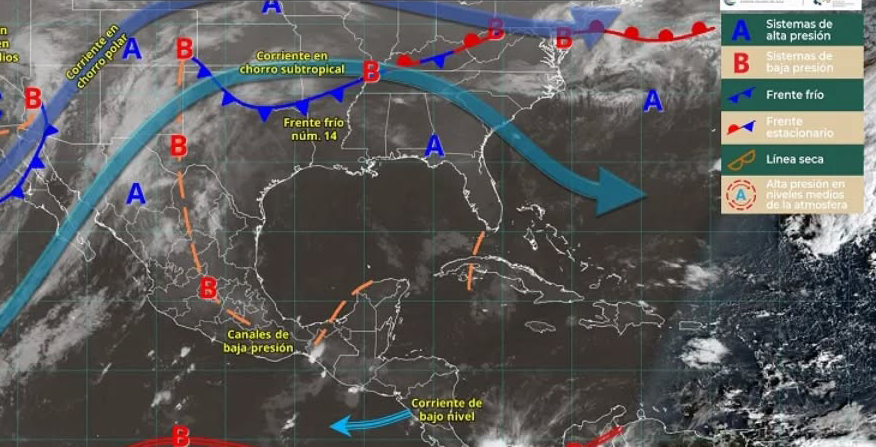 Por otro lado, el frente frío 15 asociado con una vaguada polar y con una circulación ciclónica en niveles medios y altos de la atmósfera, recorrerá el noroeste y norte de México, y en interacción con las corrientes en chorro polar y subtropical, ocasionarán lluvias puntuales fuertes en Sonora, Chihuahua y Sinaloa; y chubascos en Baja California, Baja California Sur y Durango.