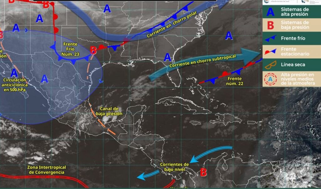 Finalmente, una circulación anticiclónica en niveles medios de la atmósfera, ocasionará tiempo estable y sin lluvia sobre entidades del noroeste, norte y occidente del territorio nacional, así como un ascenso de las temperaturas vespertinas; no obstante, persistirá ambiente frío a muy frío durante la mañana y noche en la mayor parte de los estados del norte y centro de México, así como ambiente gélido con temperaturas mínimas menores a -5 grados y heladas en zonas serranas de Chihuahua y Durango.