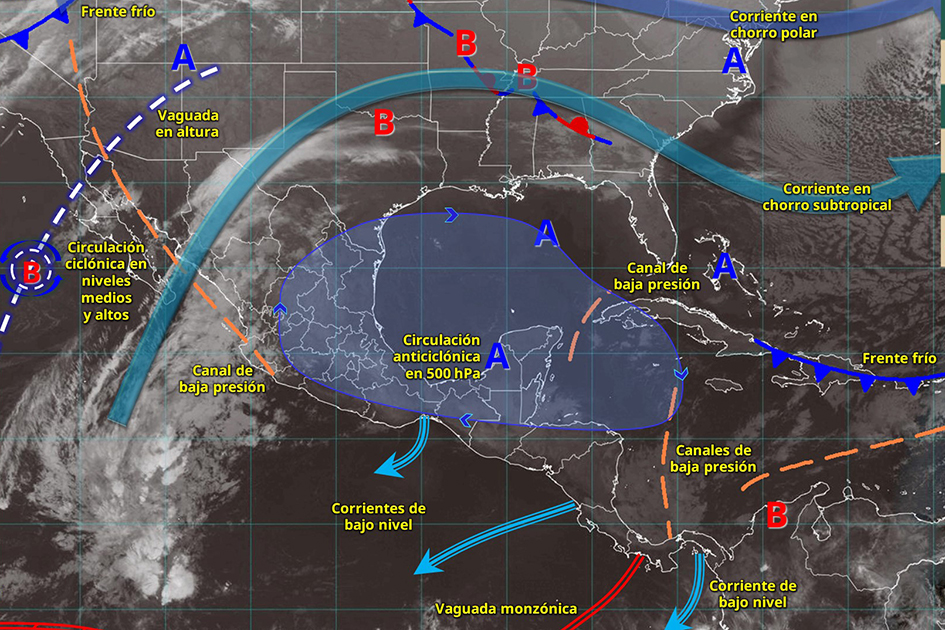 Para hoy, una circulación ciclónica en niveles medios y altos de la atmósfera y una vaguada en altura, se desplazarán lentamente sobre el noroeste y norte del territorio nacional, en interacción con el ingreso de humedad generado por la corriente en chorro subtropical hacia el noroeste, norte y occidente del país, ocasionarán rachas fuertes de viento, lluvias puntuales fuertes en Sonora, Chihuahua y Sinaloa y chubascos en la península de Baja California, Durango y Zacatecas.