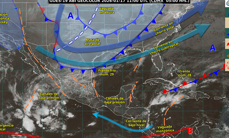 Por otro lado, el frente frío número 29 se desplazará sobre el noreste y oriente del territorio nacional, en interacción con una vaguada en altura y las corrientes en chorro polar y subtropical, originarán lluvias y chubascos en dichas regiones, así como lluvias de fuertes a muy fuertes en Querétaro, Hidalgo, Puebla y Veracruz.