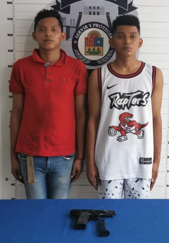 Oficiales de la Policía Quintana Roo Benito Juárez lograron la detención de dos masculinos que se identificaron como José “N” de 22 años y Marwin “N” de 18 años de edad, por el delito de portación de arma prohibida (réplica de un arma de fuego).