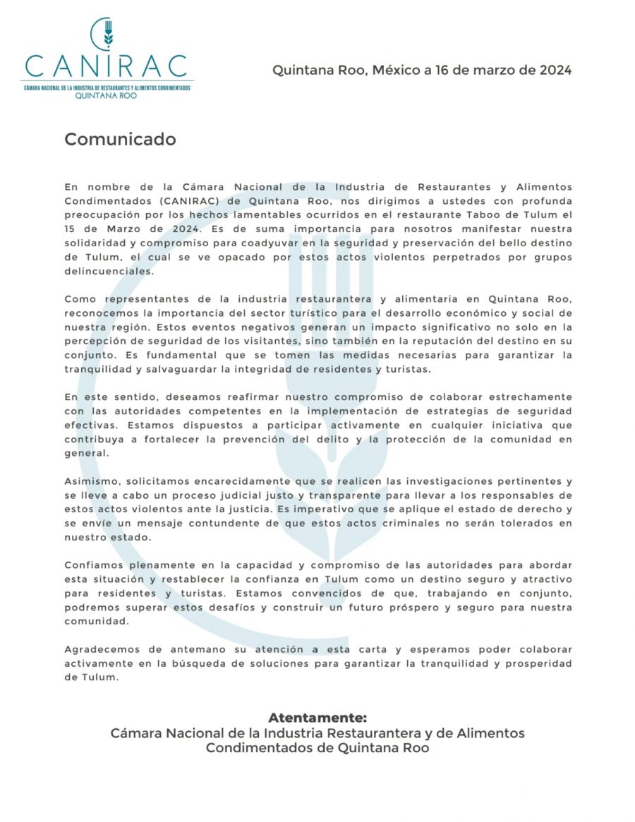 “Confiamos plenamente en la capacidad y compromiso de las autoridades para abordar esta situación y restablecer la confianza en Tulum como un destino seguro y atractivo para residentes y turistas”, concluyó.