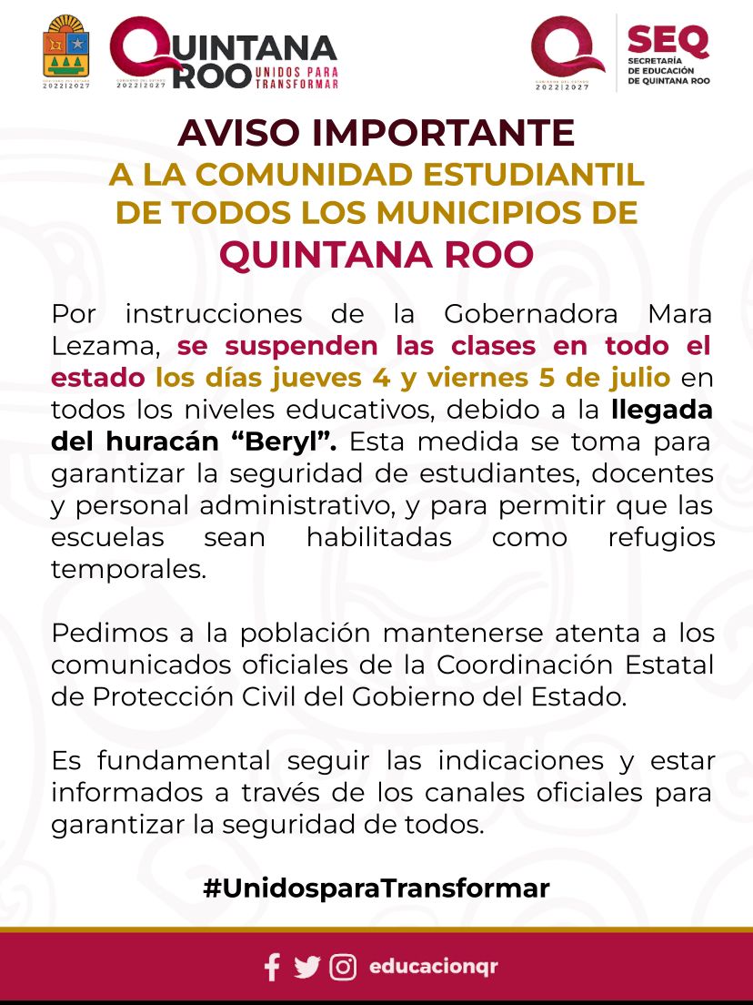 CANCÚN.- Durante el enlace ciudadano de hoy, la gobernadora Mara Lezama anunció medidas preventivas ante las condiciones climatológicas adversas que podrían impactar el estado de Quintana Roo en los próximos días. Como parte de estas medidas, se ha decidido suspender las clases en todos los niveles educativos los días jueves y viernes.