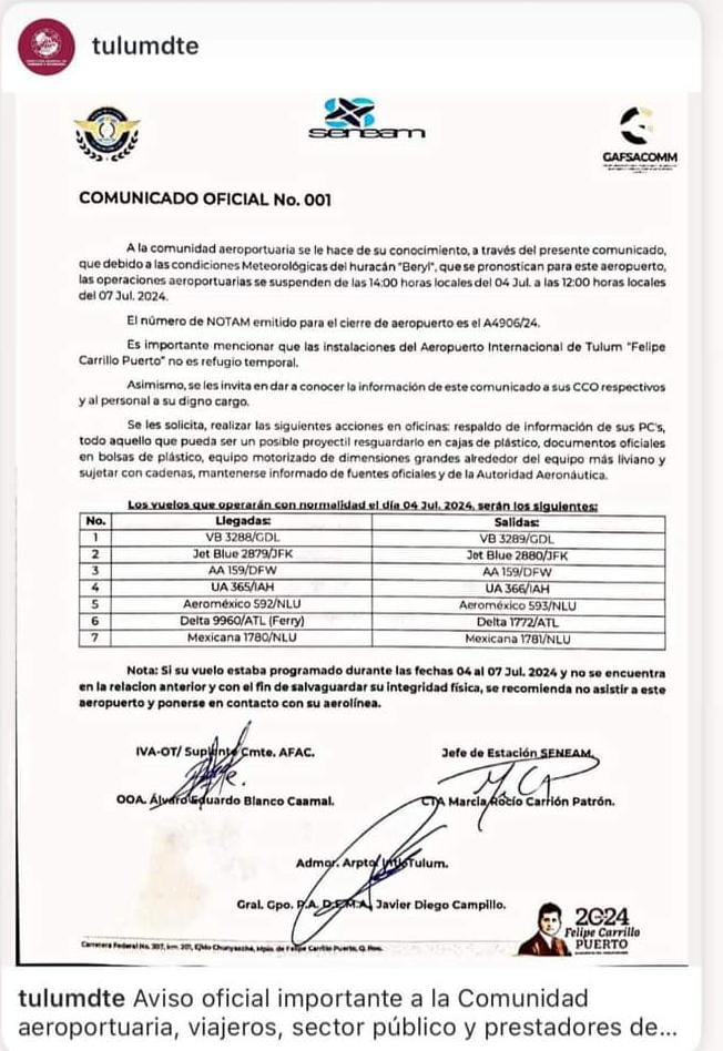 En tanto que, en el aeropuerto Tulum este retomará sus actividades hasta el domingo 7 de julio a partir de las 9 de la mañana, aunque este horario se podría modificar, ya que todo depende de las condiciones en las cuales se encuentre la terminal aérea, pues esta zona también está dentro del cono de impacto del huracán.
