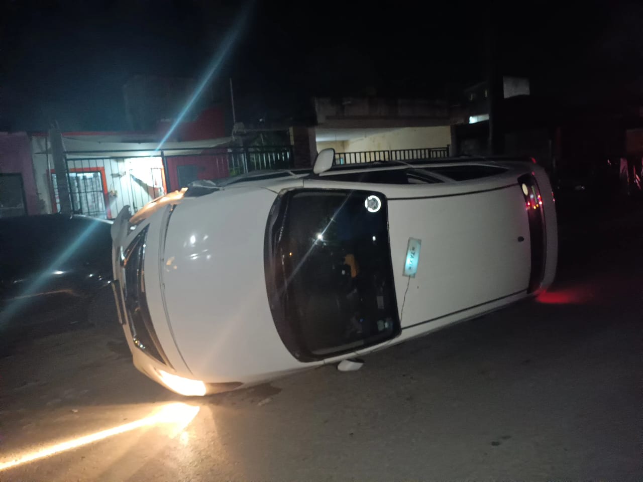 CANCÚN.- Por conducir a exceso de velocidad, un taxista de Cancún provocó un choque con un automóvil estacionado, resultando en la volcadura del taxi y lesiones al conductor. El accidente ocurrió en la avenida Niños Héroes, cerca de la región 201.