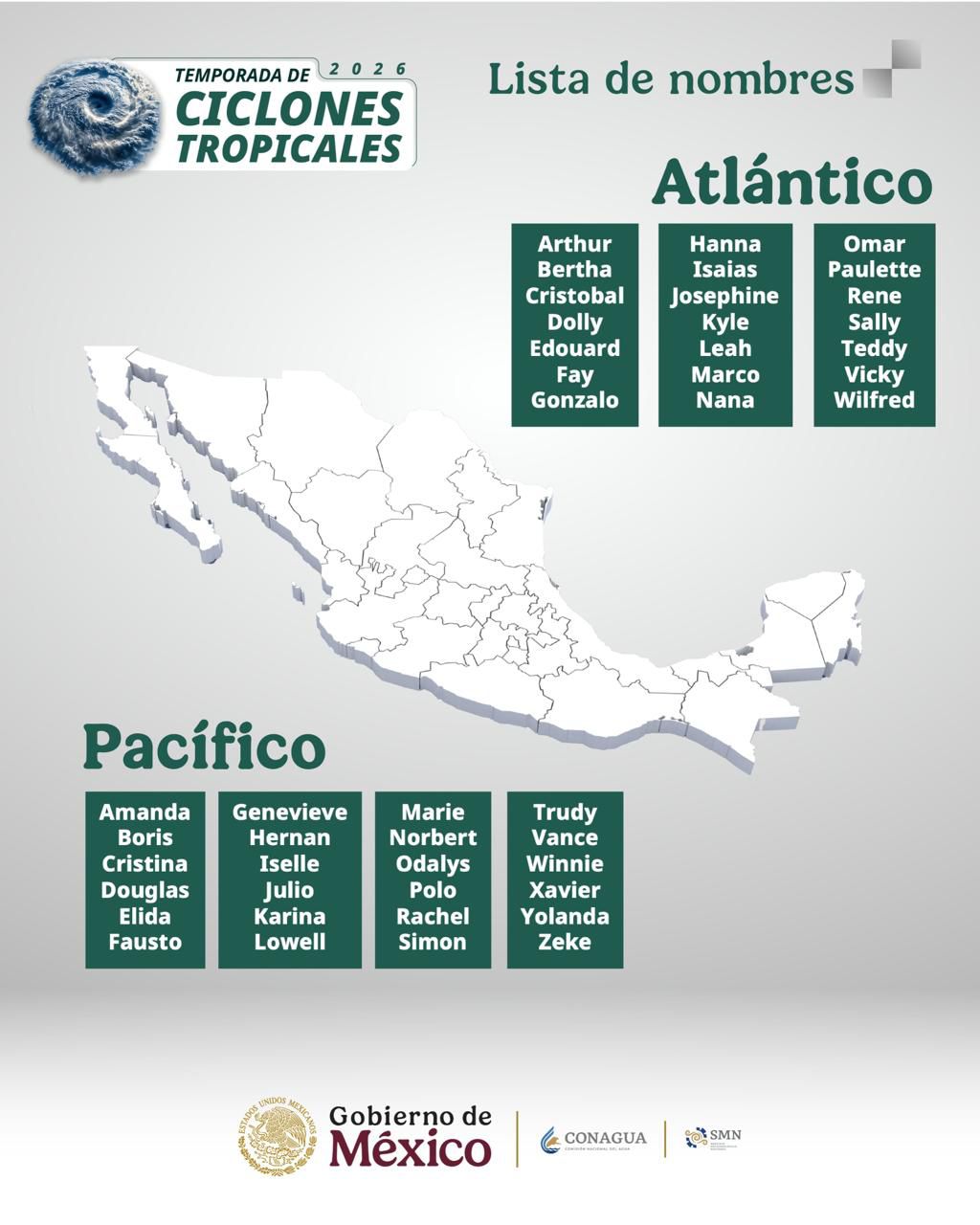 Cancún.- La Comisión Nacional del Agua (Conagua) dio a conocer el pronóstico oficial de la temporada de ciclones tropicales 2026 en el Atlántico, en la que se prevé la formación de entre 11 y 15 sistemas, informó la gobernadora Mara Lezama Espinosa.
