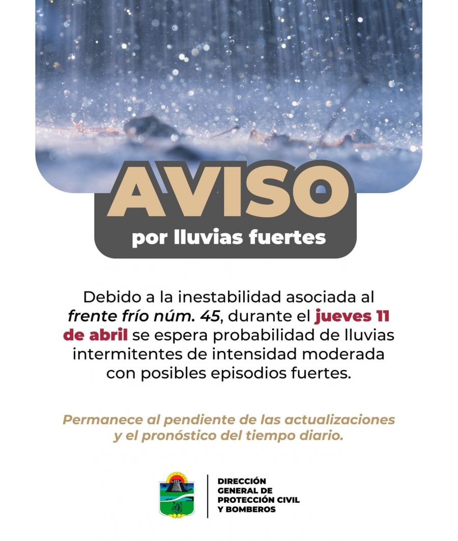 TULUM.- La Dirección General de Protección Civil y Bomberos Tulum advierte sobre los posibles efectos de una inestabilidad asociada a Frente Frío 45 para este jueves 11 de abril de 2024.
