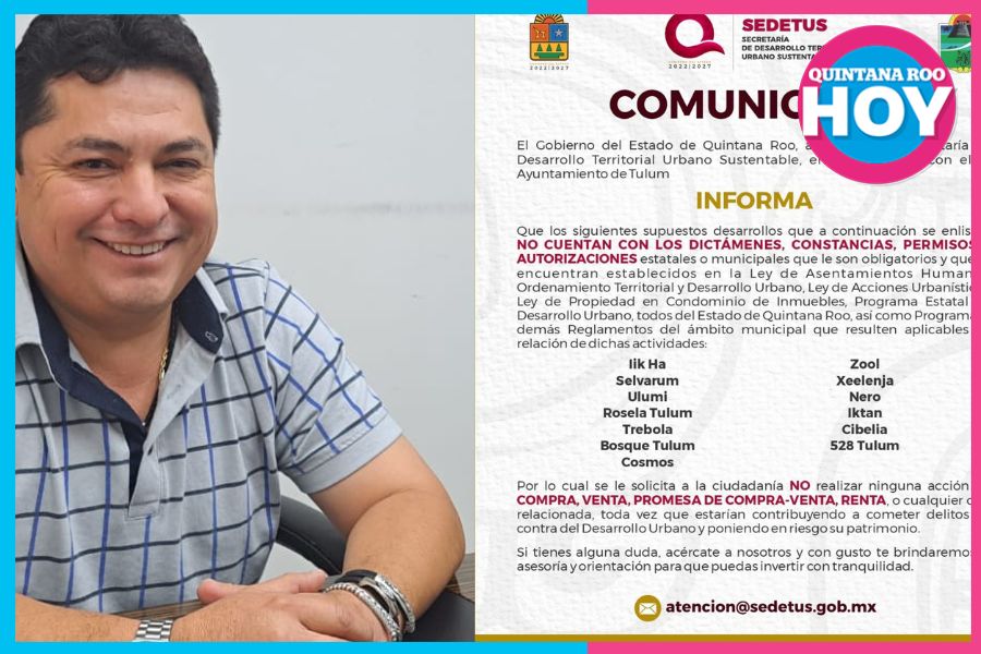 TULUM.– Derivado del comunicado emitido por la Secretaría de Desarrollo Territorial Urbano Sustentable (SEDETUS) sobre irregularidades en proyectos inmobiliarios, el director general de Desarrollo Urbano de Tulum, Lorenzo Miranda Miranda, precisó que en el municipio se contabilizan 26 desarrollos en diferentes estados de legalidad, de los cuales 12 ya concluyeron sus trámites, 8 se encuentran en proceso y 6 aún no han ingresado documentación.