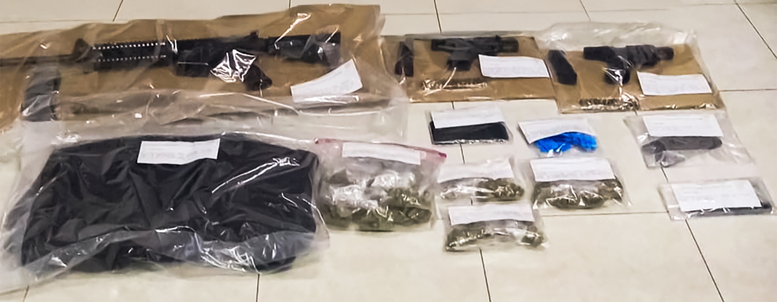 El resultado reveló un arsenal preocupante: armas cortas, un arma larga, cargadores abastecidos y cartuchos útiles, además de dosis de hierba seca tipo marihuana y polvo granulado con características del cristal.