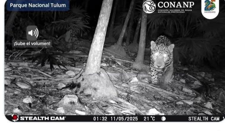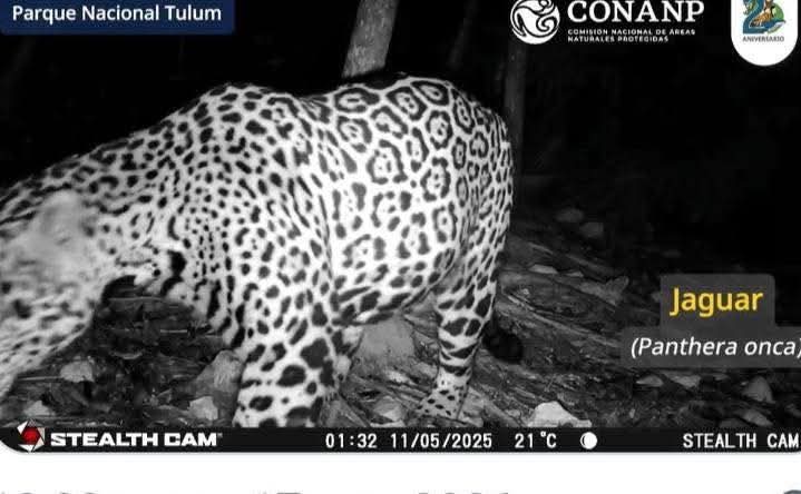 El registro fue documentado por integrantes del Grupo de Vigilancia y Monitoreo Comunitario del Parque Nacional Tulum, quienes realizan recorridos constantes y supervisión mediante cámaras trampa en distintos puntos del área natural protegida. De acuerdo con especialistas, el jaguar (Panthera onca) continúa utilizando este territorio como parte de su hábitat y de los corredores biológicos que conectan la selva costera con otras áreas de conservación del norte de Quintana Roo.