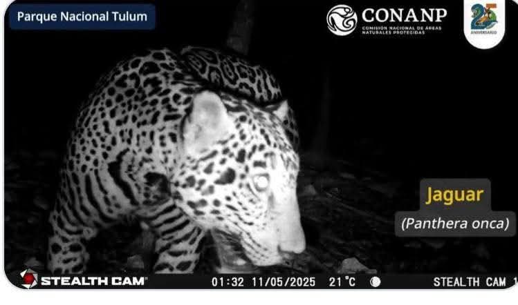 Tulum.- Un ejemplar de jaguar fue captado recientemente por una cámara de monitoreo ambiental a aproximadamente 200 metros de la zona arqueológica de Tulum, dentro del Parque Nacional Tulum, una de las áreas con mayor afluencia turística del estado. El registro fue confirmado por autoridades ambientales federales.