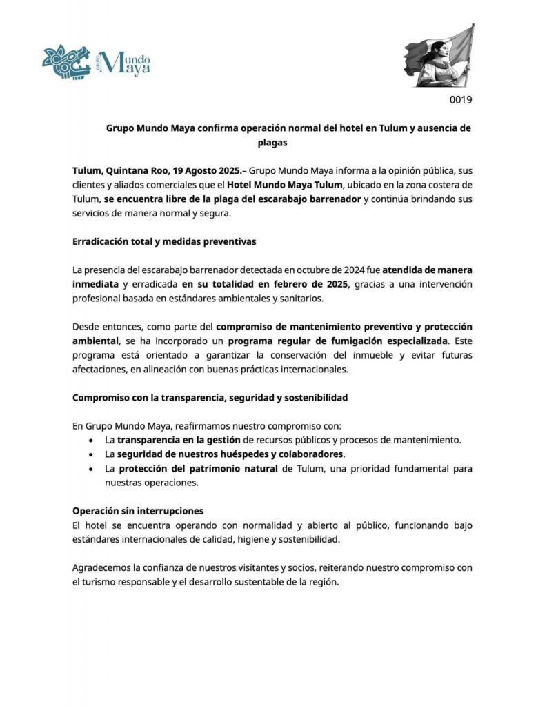 Tulum.- Tras versiones difundidas en redes sociales sobre una supuesta infestación del gusano barrenador en las instalaciones del Hotel Mundo Maya Tulum, la empresa Grupo Mundo Maya emitió un comunicado para aclarar la situación y confirmar que el complejo turístico se encuentra libre de plagas y operando con normalidad.