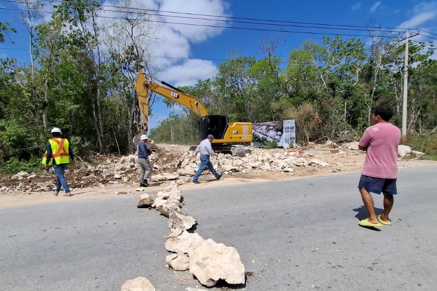 Los moradores de la zona atravesaron rocas sobre esta vialidad, que lleva no solo a su colonia, sino a varios hoteles y a la nueva colonia Marciano Dzul Caamal, para exigir la reparación de las líneas eléctricas cortadas, al parecer por maquinaria pesada en el lugar.