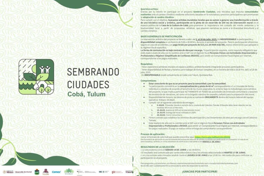 Residir actualmente en Cobá o Tulum, Quintana Roo. Tener experiencia previa en muralismo en espacios públicos. Estar dado/a de alta ante el SAT bajo el régimen de Personas Físicas con Actividades Empresariales y Profesionales o RESICO.