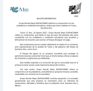 El consorcio subrayó que el parque tiene como eje central la protección del patrimonio natural y cultural de Tulum, además de convertirse en un espacio de identidad y recreación. “La comunidad local es la primera en tener acceso a este desarrollo turístico”, destacó la misiva.