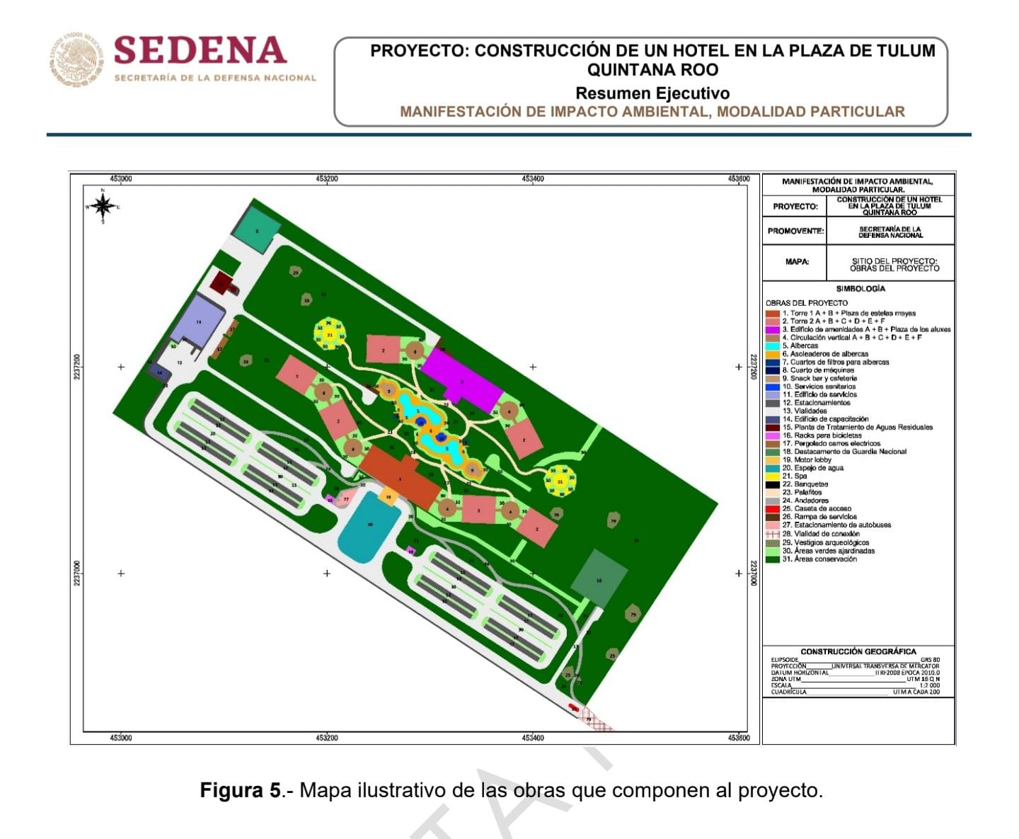 Según el proyecto de la MIA, el Hotel Plaza Tulum incluye albercas, asoleaderos, un bar, cafetería, estacionamientos, vialidades, una planta de tratamiento de aguas residuales, spa, palafitos,andadores, estacionamiento, así como un destacamento de la Guardia Nacional.
