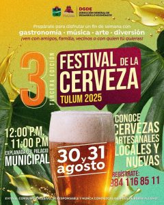 Tulum.- La Dirección General de Desarrollo Económico anunció la realización de la tercera edición del Festival de la Cerveza Tulum 2025, un evento que busca impulsar la convivencia, la cultura y la economía local a través de la gastronomía, la música y el arte.