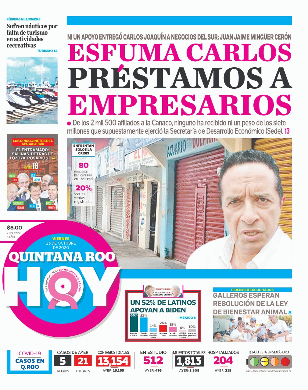 El 23 de octubre salió el tema “Esfuma Carlos préstamos a empresarios”, esto surgió por una entrevista con el dirigente de la Canaco, Jaime Mingüer Cerón, quien reveló que de los dos mil 500 afiliados a la cámara, ninguno había recibido un peso de los siete millones que supuestamente ejerció la Secretaría de Desarrollo Económico (Sede).