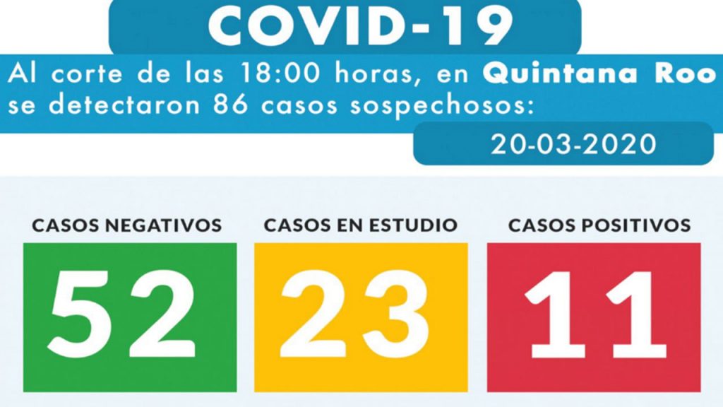 CANCÚN.- Por la tarde de este viernes, Alejandra Aguirre, la secretaria de Salud en el Estado, dio a conocer que hasta el momento en Quintana Roo se detectaron 86 casos sospechosos: 52 negativos, 23 en estudio y 11 positivos a coronavirus.