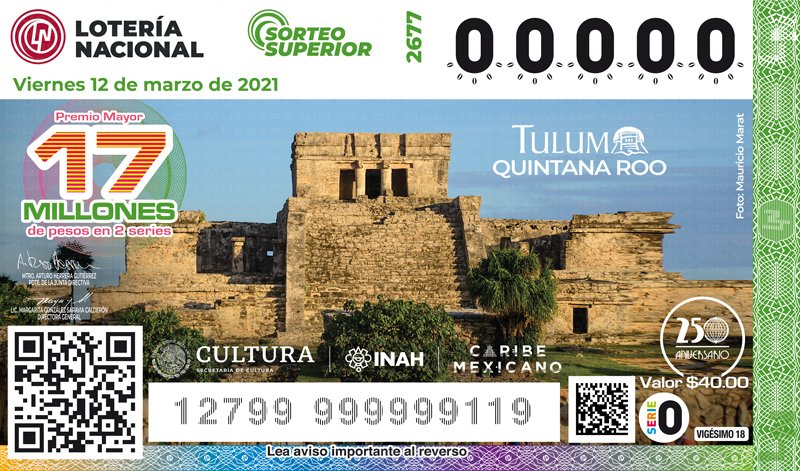 La funcionaria informó que los billetes con la imagen de Tulum salen a la venta este 6 de marzo, y podrán adquirirse hasta el día de la celebración del Sorteo Superior No. 2677, el viernes 12 de marzo, a las 20:00 horas, el cual se llevará a cabo en el salón de sorteos del Edificio “El Moro”. El Premio Mayor será de 17 millones de pesos en dos series y reparte una bolsa de 51 millones de pesos en premios.
