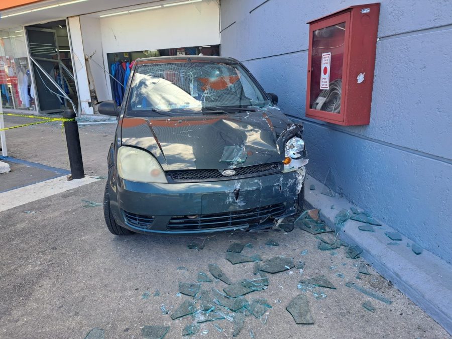 Los hechos ocurrieron a las 2:45 de la tarde, cuando la conductora de un auto de la marca Ford, tipo Fiesta, gris, perdió el control y se brincó los topes del estacionamiento, chocando contra la puerta de cristal de la tienda Modatelas.