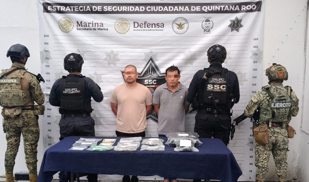 Playa del Carmen.- En un operativo coordinado por múltiples instituciones de seguridad, fueron detenidos Erik “N” y Edgar Nemesio “N”, presuntos implicados en delitos contra la salud y vinculados a un reporte de extorsión en una lavandería local.
