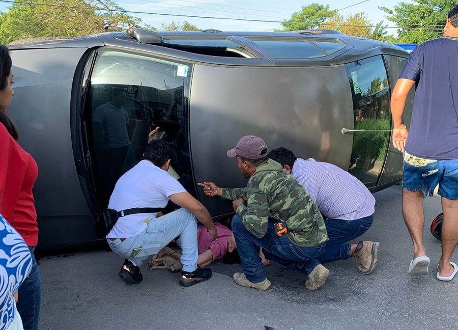 CHETUMAL.- Un aparatoso choque entre un auto compacto y una camioneta terminó esta tarde en volcadura, dejando al menos tres personas lesionadas, en Chetumal.