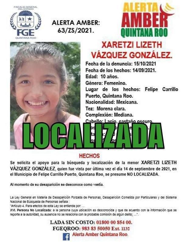La menor de 10 años de edad que fue reportada como desaparecida desde el pasado 14 de septiembre del 2021 vista por última vez en Felipe Carrillo Puerto ha sido localizada con vida desde el día de ayer, de acuerdo con un comunicado de la fiscalía general del estado quienes desactivaron la ficha de búsqueda.