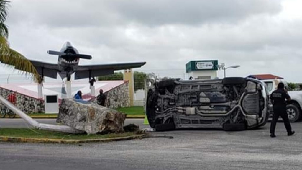 Cozumel.– El ex presidente municipal Aurelio Joaquín y pariente del actual presidente de la isla, protagonizó un accidente en frente de la Base Aérea Militar #4, el vehículo impactó con la placa de Fuerza Aérea por lo que la derribó junto con un poste, esto ocasionó que la camioneta se volcara.