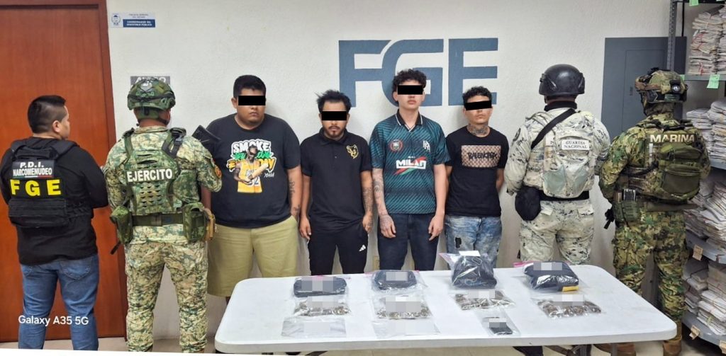 Cerca del lugar donde llevaron a cabo el cateo, las autoridades participantes se percataron de la presencia de cuatro masculinos, quienes intercambiaban bolsas, por lo que procedieron a la revisión correspondiente, encontrándoles con hierba verde similar a la marihuana, posteriormente detuvieron a Jhonatan Alberto “N”, José Gabriel “N”, Antony Emanuel “N” y Sayir Aurelius “N”.