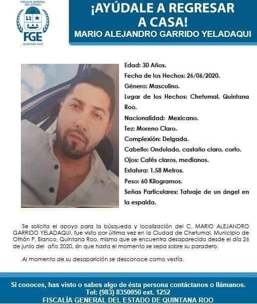 El viernes pasado fue reportada la desaparición de Mario Alejandro Garrido Yeladaqui. Sus familiares temen lo peor y solicitan el apoyo de las autoridades y ciudadanía en general para su localización.