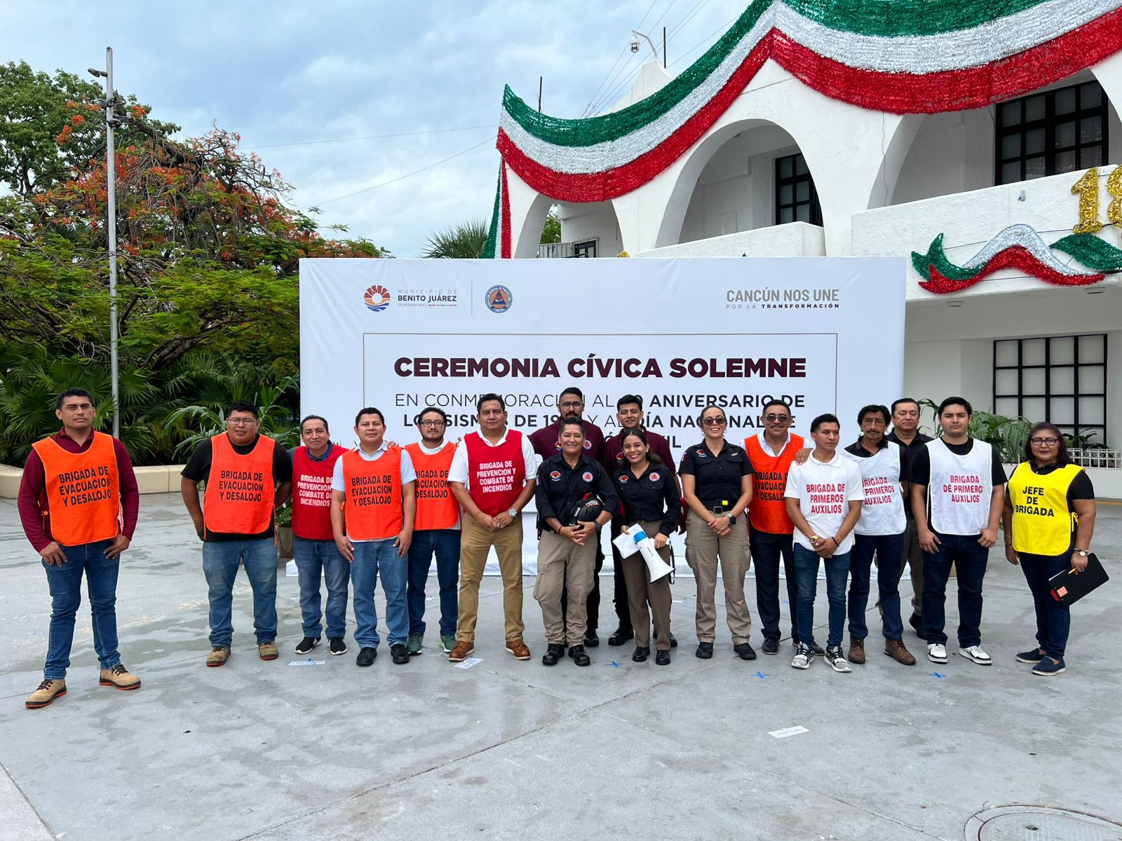 CANCÚN,- Con motivo de la conmemoración del aniversario de los sismos ocurridos en México, se llevó a cabo un simulacro frente al Palacio Municipal de Benito Juárez, en el que participaron cuerpos de seguridad, emergencia y protección civil.